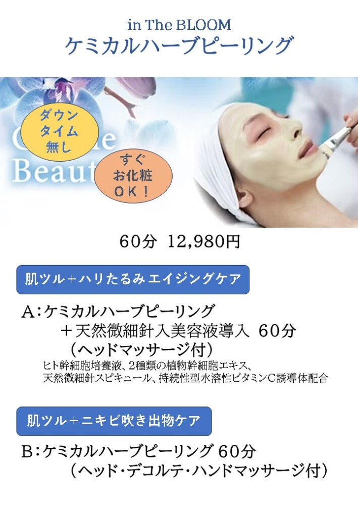 ピーリング効果だけではなく、細胞増殖因子と抗糖化、抗酸化成分を含む資材を使用し、肌質改善(肌育)とピーリングが同時に叶うスペシャルトリートメントになります。